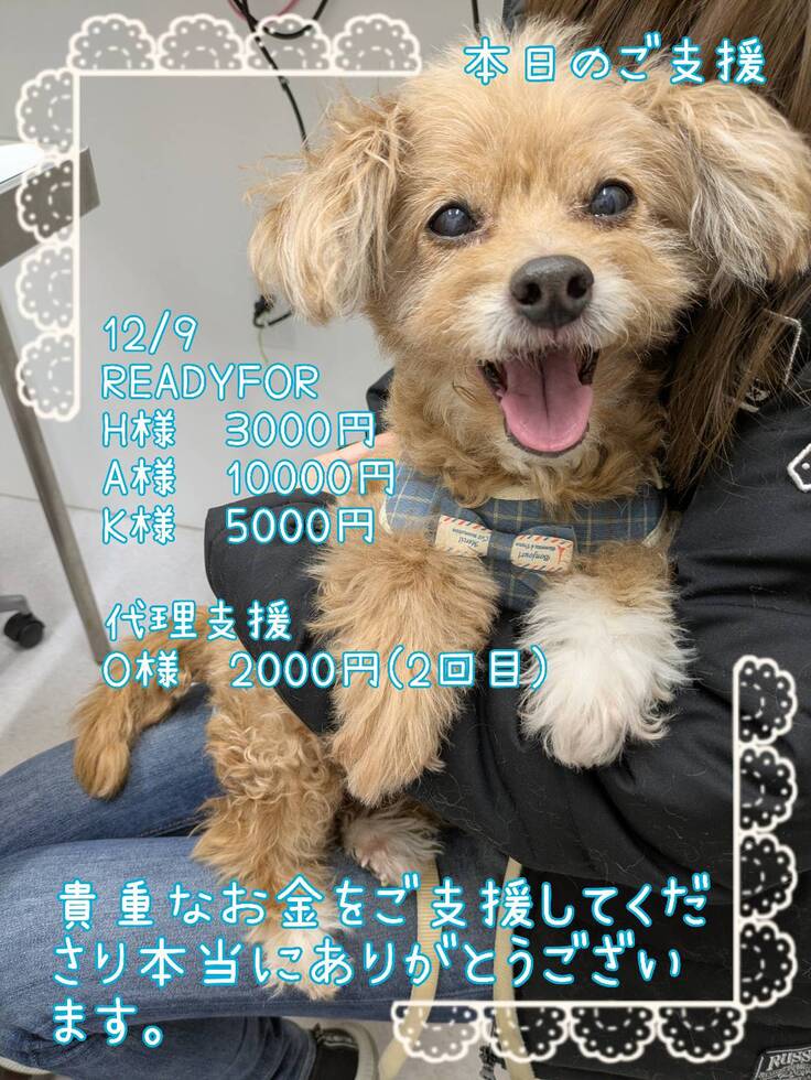 ご支援金は全て、ちゃわの手術費、入院費、通院費に充てさせて頂きますので、リターンに費用を掛けられず、申し訳ございません。