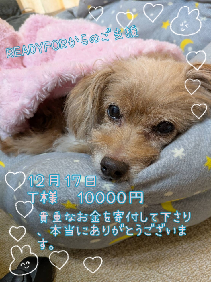 ご支援金は全て、ちゃわの手術費、入院費、通院費に充てさせて頂きますので、リターンに費用を掛けられず、申し訳ございません。