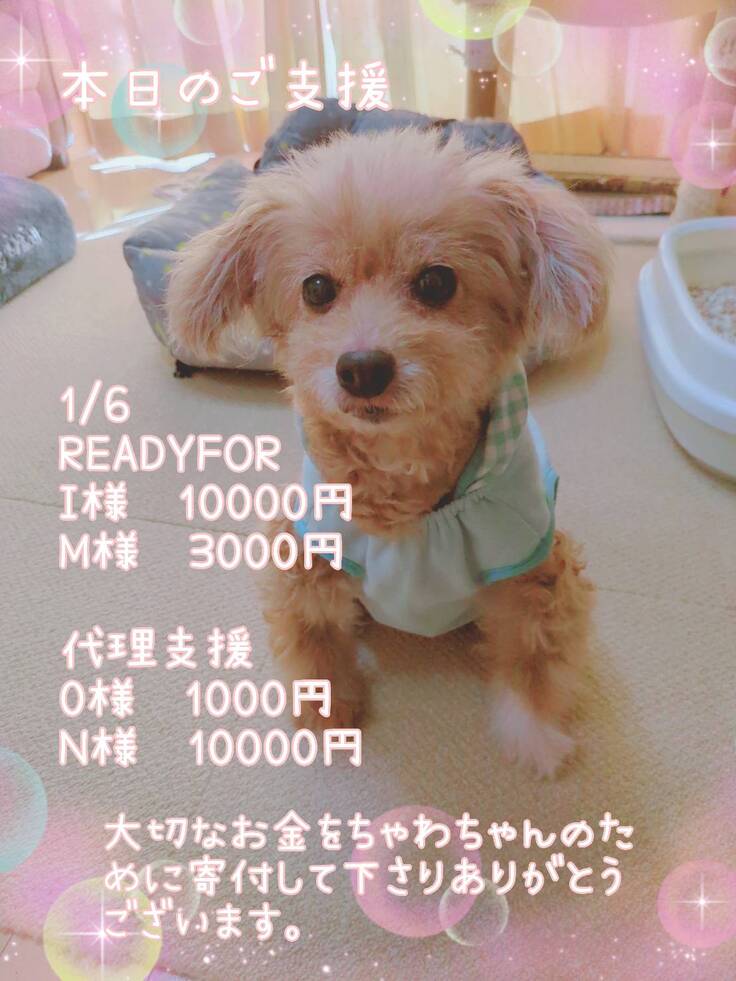 ご支援金は全て、ちゃわの手術費、入院費、通院費に充てさせて頂きますので、リターンに費用を掛けられず、申し訳ございません。