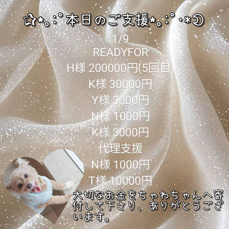 ご支援金は全て、ちゃわの手術費、入院費、通院費に充てさせて頂きますので、リターンに費用を掛けられず、申し訳ございません。