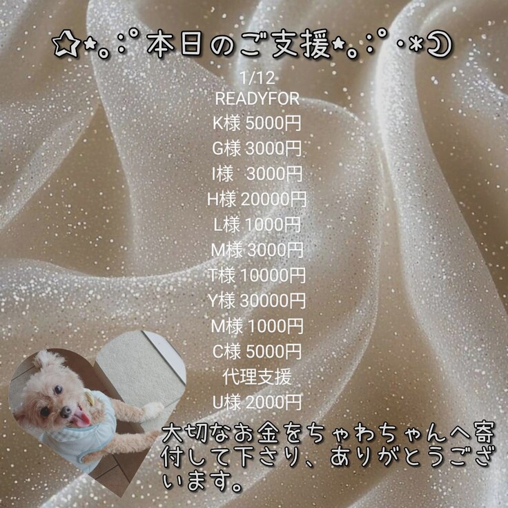 ご支援金は全て、ちゃわの手術費、入院費、通院費に充てさせて頂きますので、リターンに費用を掛けられず、申し訳ございません。