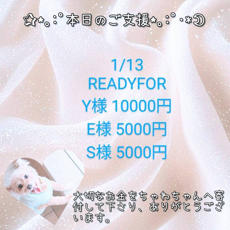 ご支援金は全て、ちゃわの手術費、入院費、通院費に充てさせて頂きますので、リターンに費用を掛けられず、申し訳ございません。