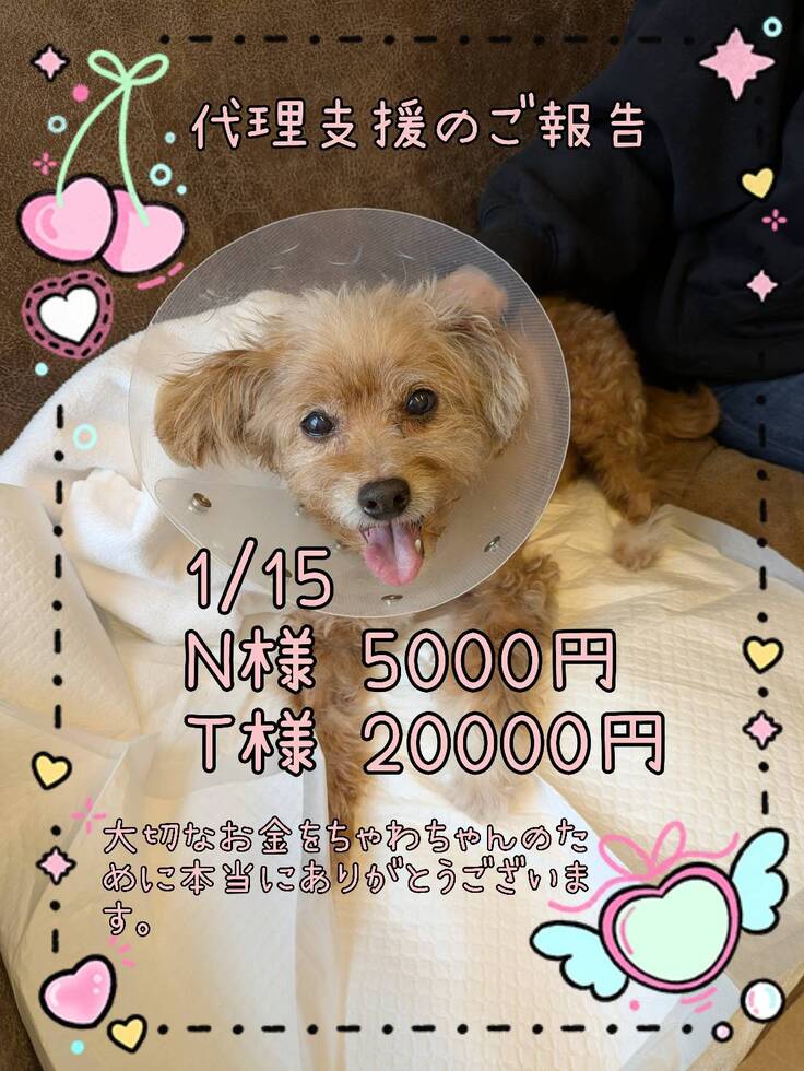 ご支援金は全て、ちゃわの手術費、入院費、通院費に充てさせて頂きますので、リターンに費用を掛けられず、申し訳ございません。