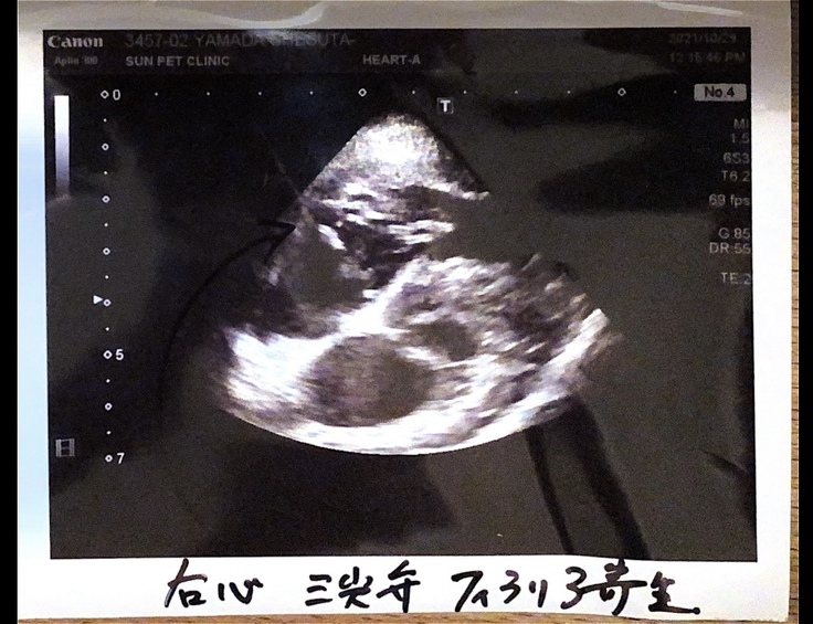 エコー写真を見て発覚したのは、フィラリア成虫が右心房から右心室に流れる間にある弁(三尖弁)に大量に絡みついており、弁がしっかり閉じられていないという状態になっていました。