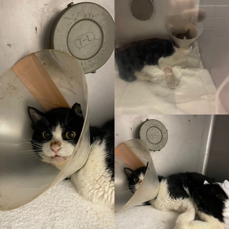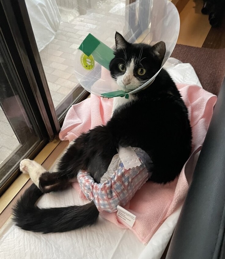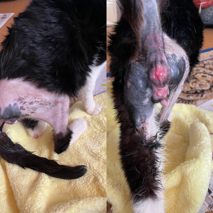 そうこうしているうちに、11月末から突然姿が見えなくなり、心配していたところ12月9日の夜に、私が仕事中に突然息子から、「白黒ちゃん(まだ名前がなかったので)が、ガリガリにやせて家の縁側に横たわっていたから、とりあえず家にいれた」と連絡があり、仕事後に帰宅したところ、ぐったりした様子で下半身は血まみれで、とてもじゃないけど見ていられない程ひどい状態でした。