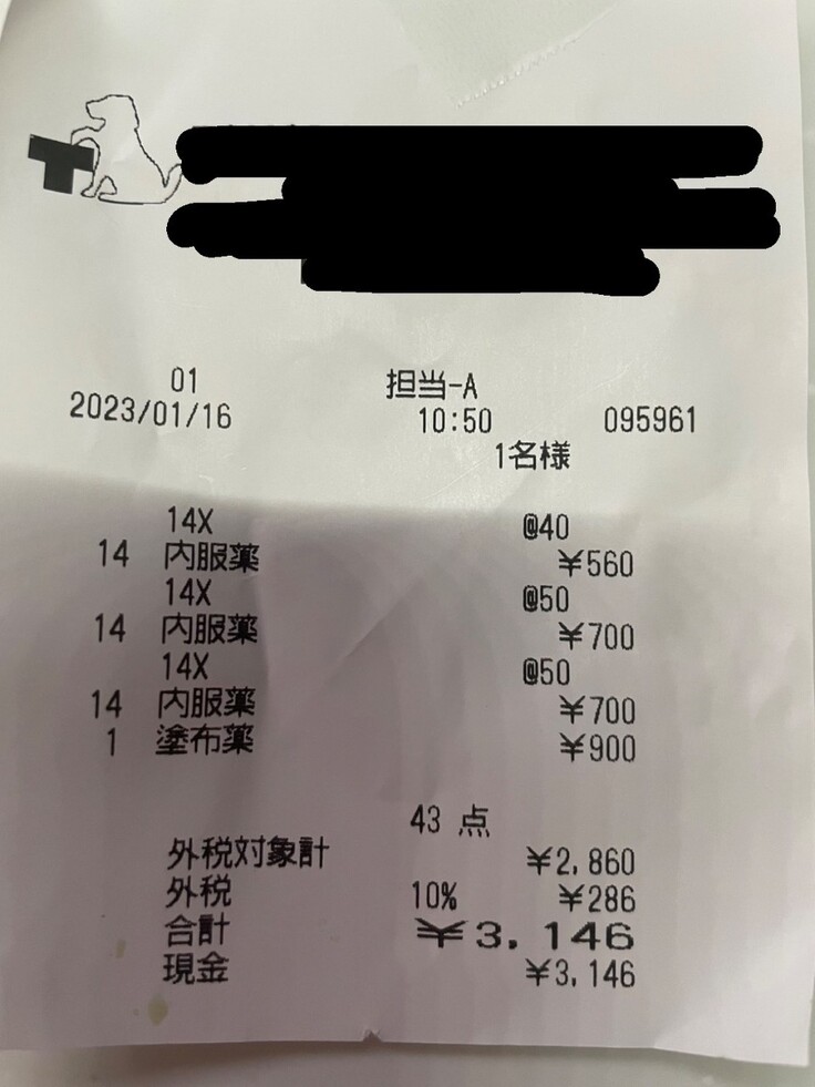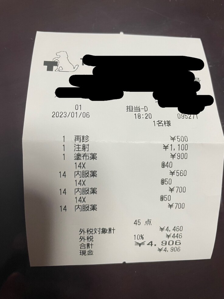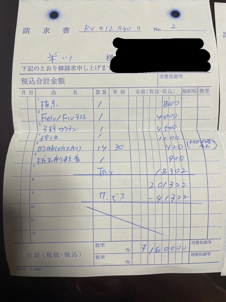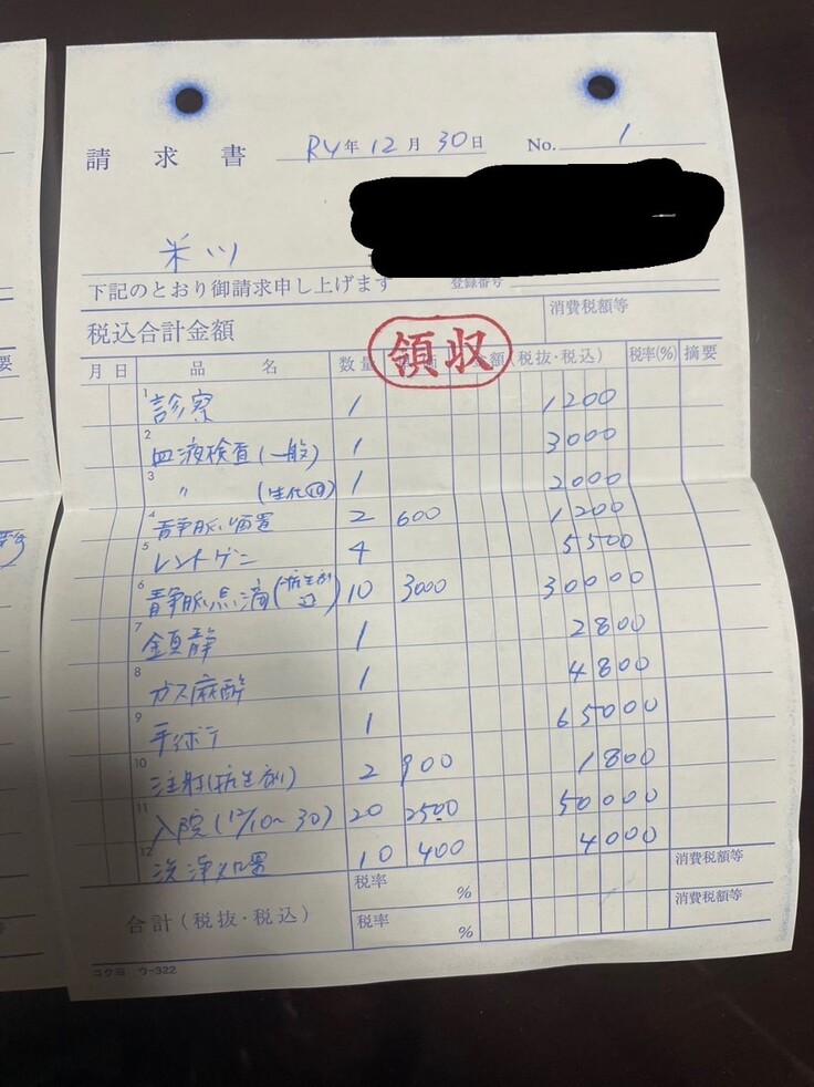 動物病院さんが野良猫保護に協力的な病院でしたので、入院費や手術代等を一般の診療金額より、良心的に請求されました。(領収書のサービス欄参照)
