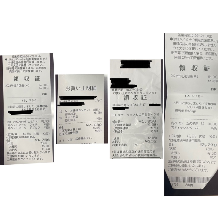 〈ホームセンター等で購入したオムツ、ペットシート、ゲージ等の領収書 まとめ〉