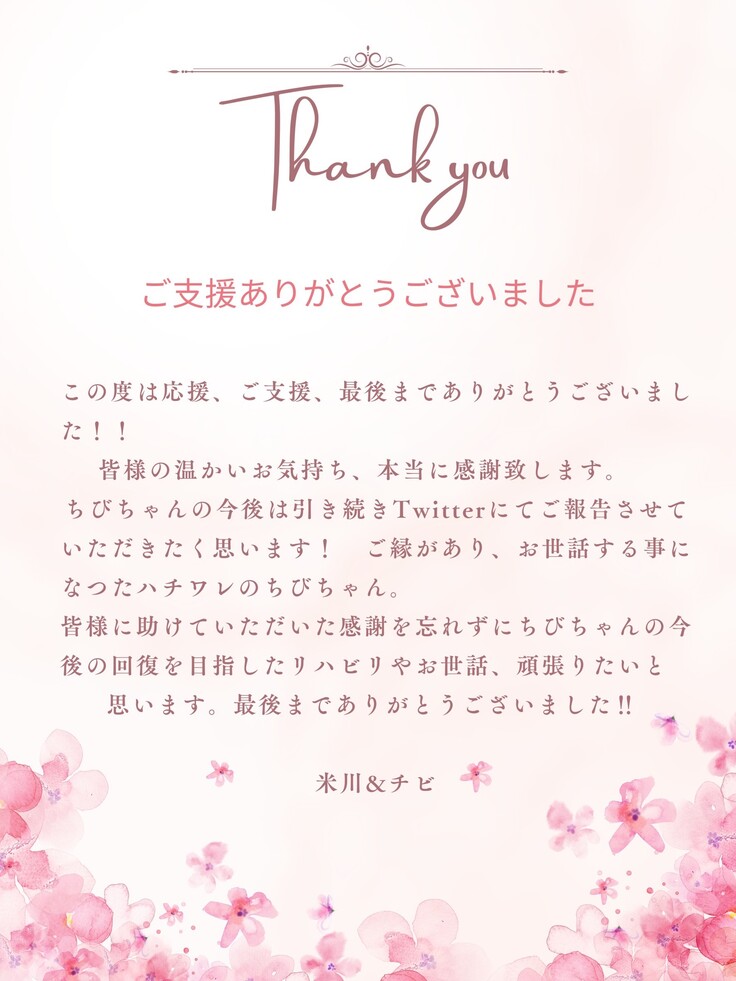 これまでのちびちゃんの手術費、入院費、今後の治療費に全て当てさせて頂きたいと思います。