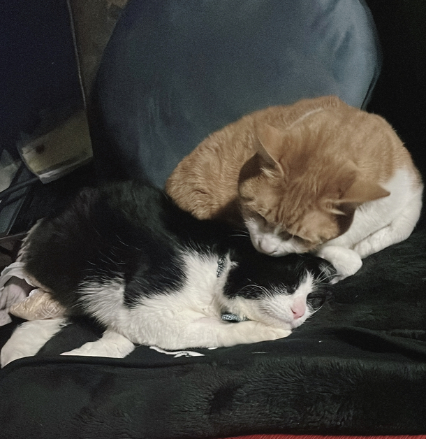 先住猫🐈ミルちゃんのたくさんの、愛に見守られながら今日も幸せそうに眠るちびちゃんです🐈⬛🐾