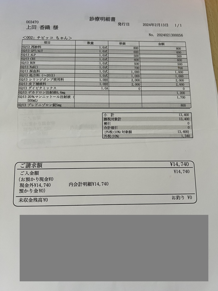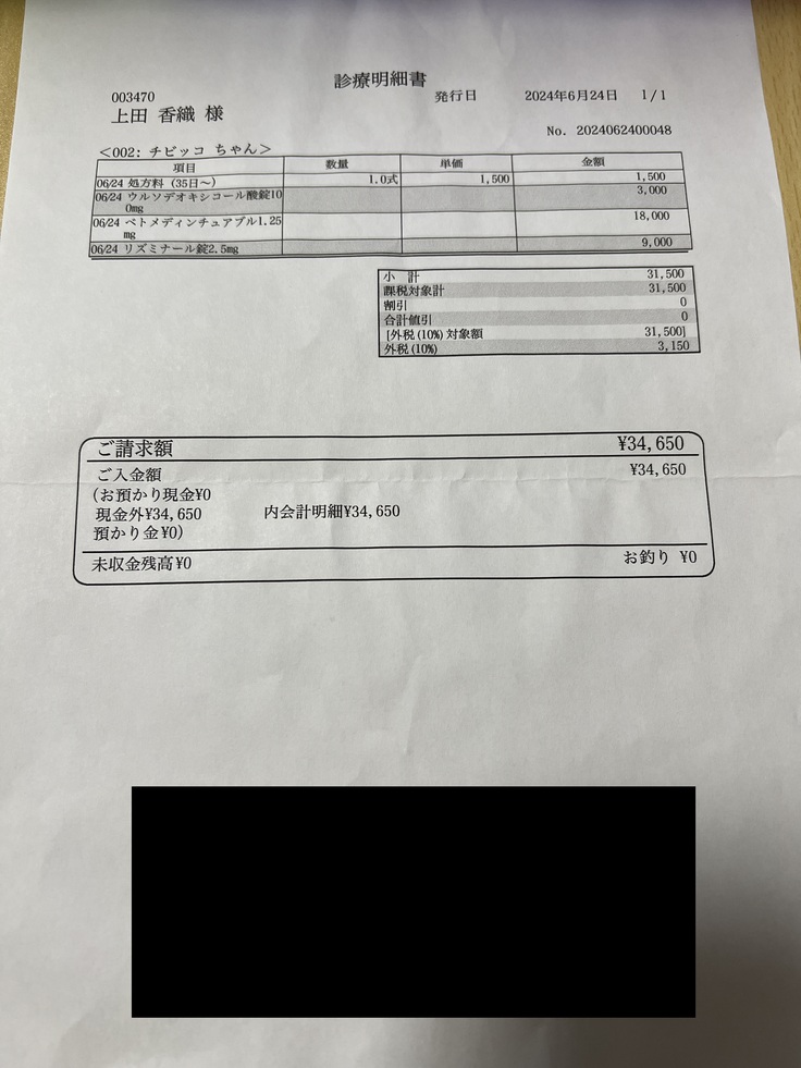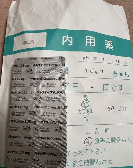 担当獣医師とよく話し合い、胆嚢粘液嚢腫と僧帽弁閉鎖不全症のお薬は休薬し、まずは現状の治療を可能な範囲で最優先しましょうとご提案いただき、未開封で持っていた胆嚢と心臓のお薬は全て返金対応をして下さり、今回の入院費用で相殺していただけました。