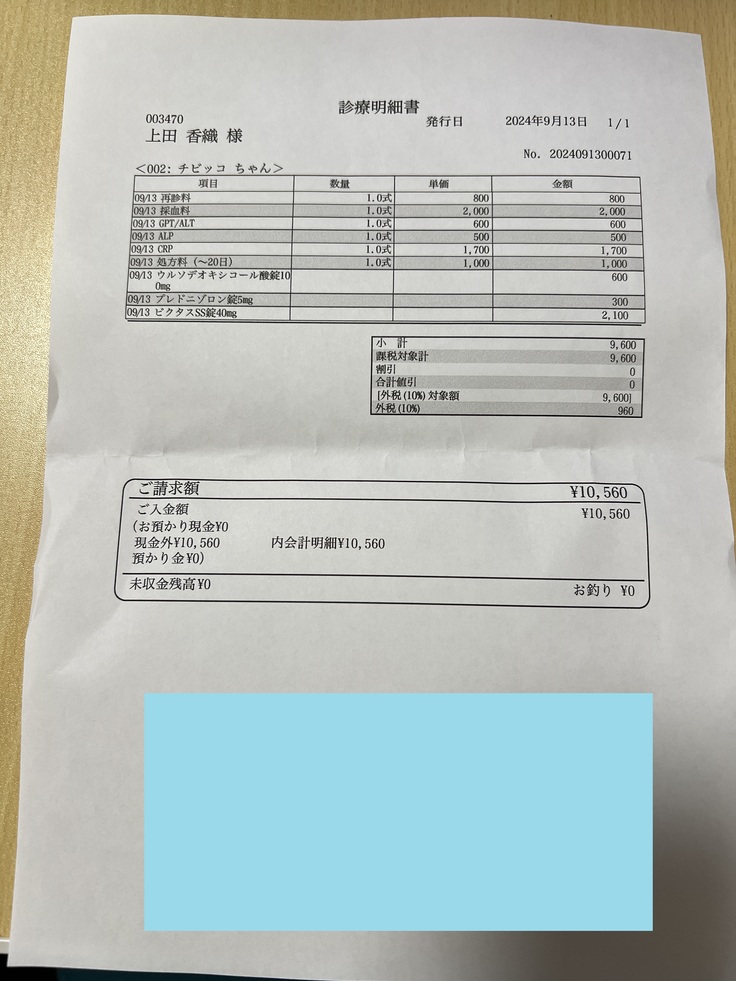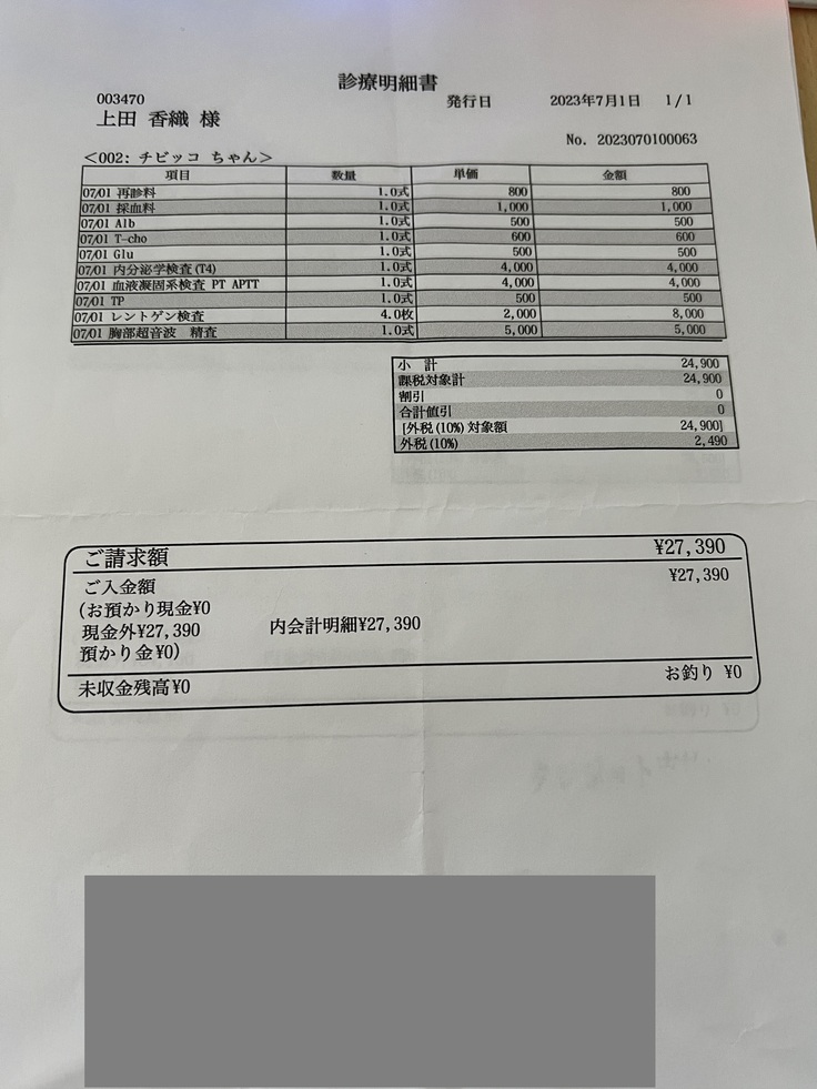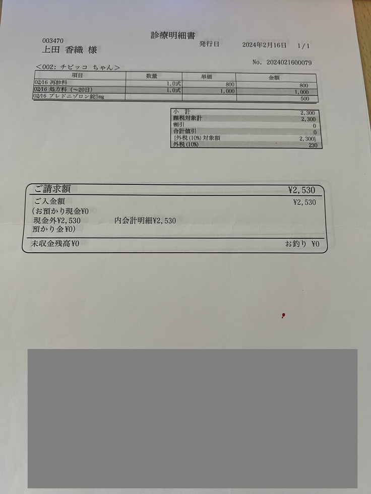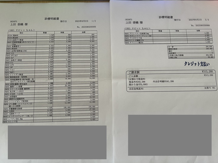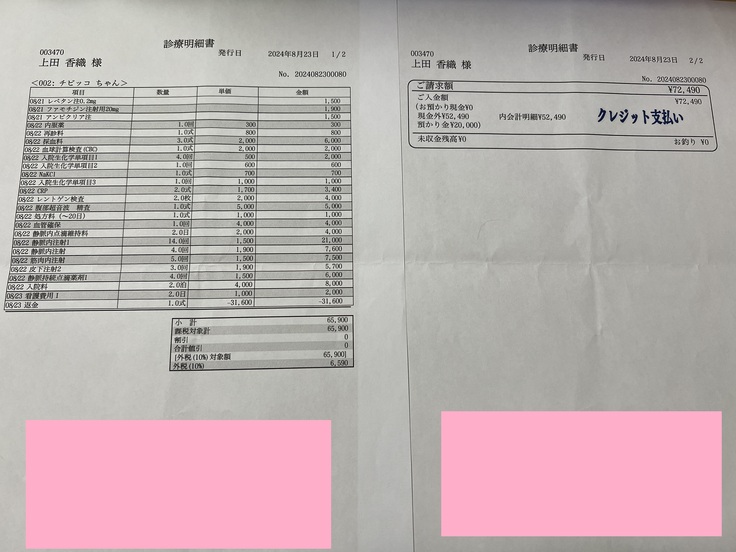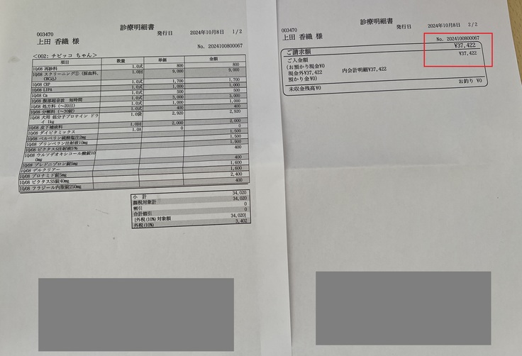 これまでの1年間(2023.7~2024.9.8)のちびっこの先述の病気の診療明細書の一部を掲載しております。