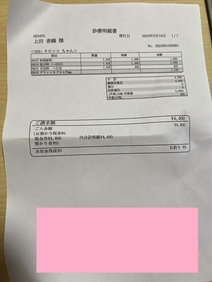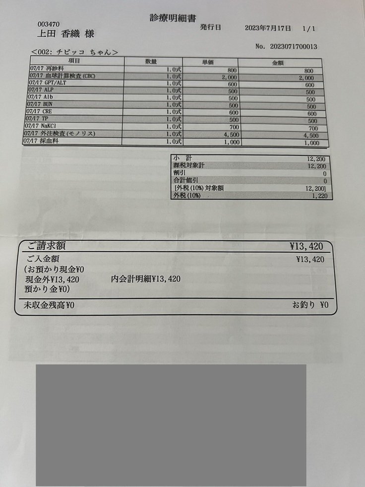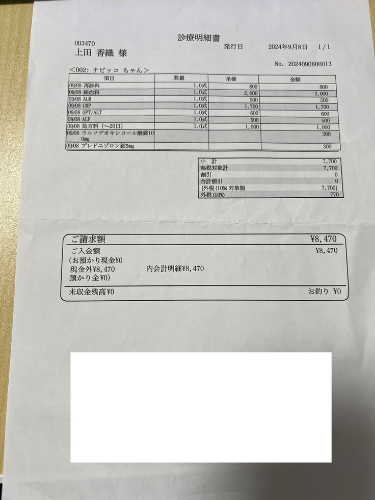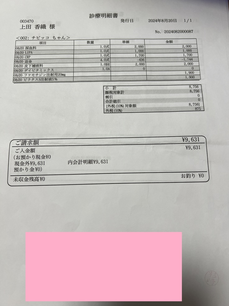 これまでの1年間(2023.7~2024.9.8)のちびっこの先述の病気の診療明細書の一部を掲載しております。