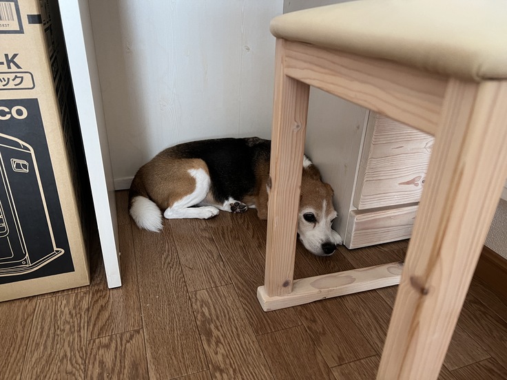 13:30に仕事から帰って来たところ、いつもは入らない私のドレッサーの下に潜り込んで隠れており、やっぱりまだ調子が良くないように思えます。