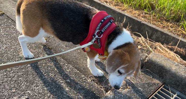 (↓今朝の朝散歩の様子。今朝は15分ほど歩いてくれました。)