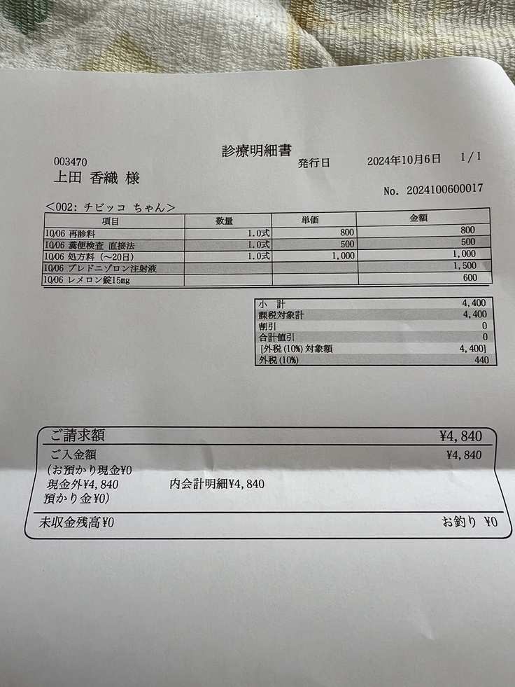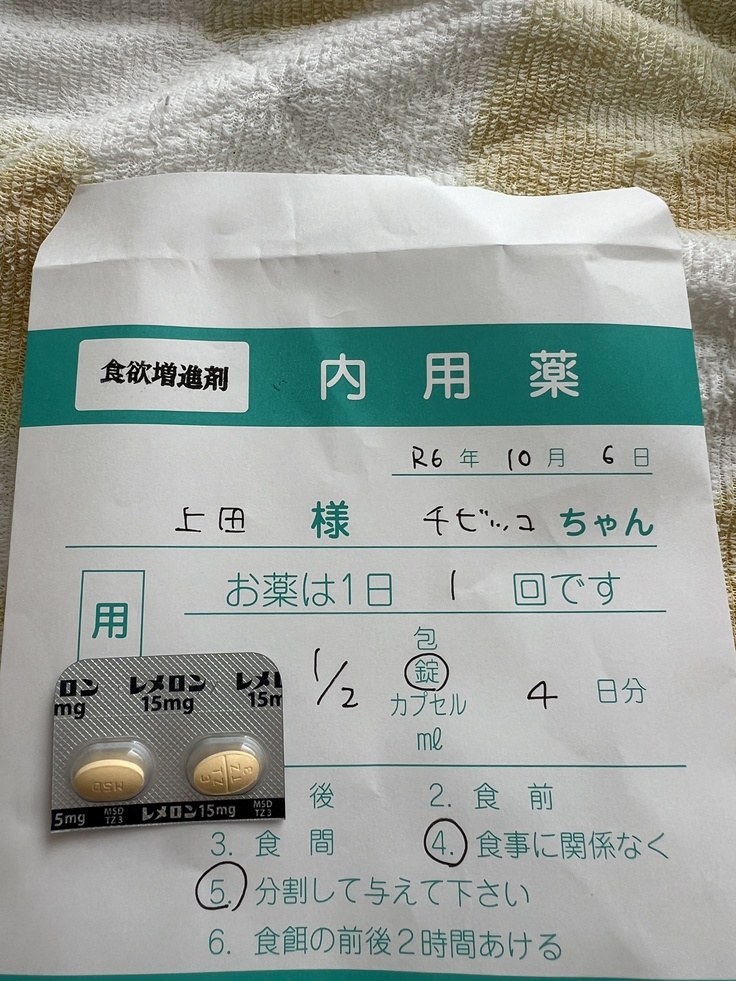 幸いにも今日から3日間担当獣医師が出勤とのことで、まずは10/8まで食欲増進剤の投薬と頑張って通院してステロイド剤注射投与という治療方針になりました。