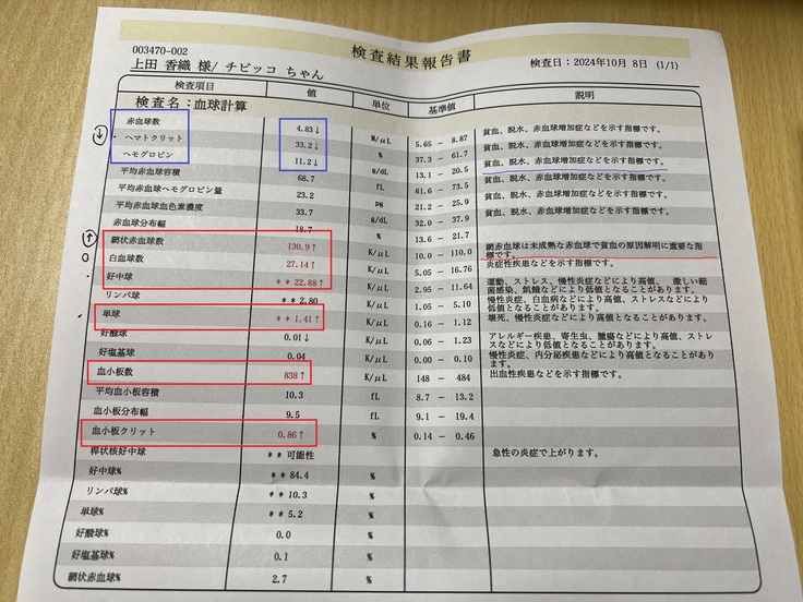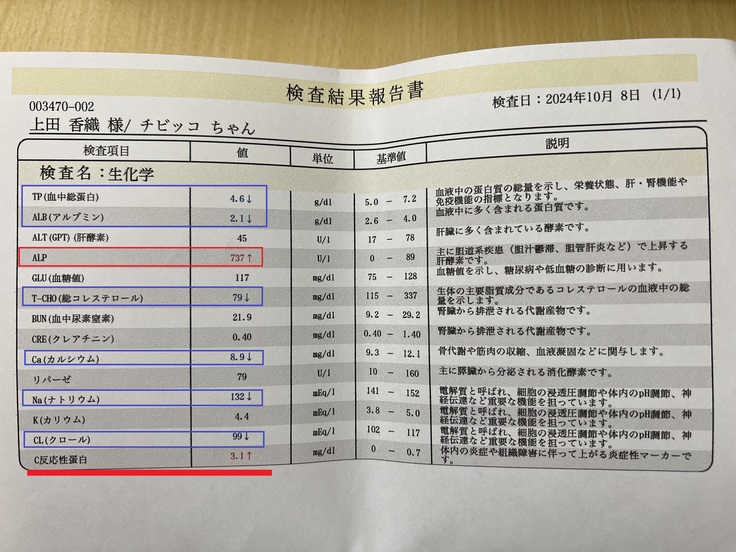 ↑①青枠の項目が下降しており、貧血と脱水症状を起こしてしていることがわかりました。