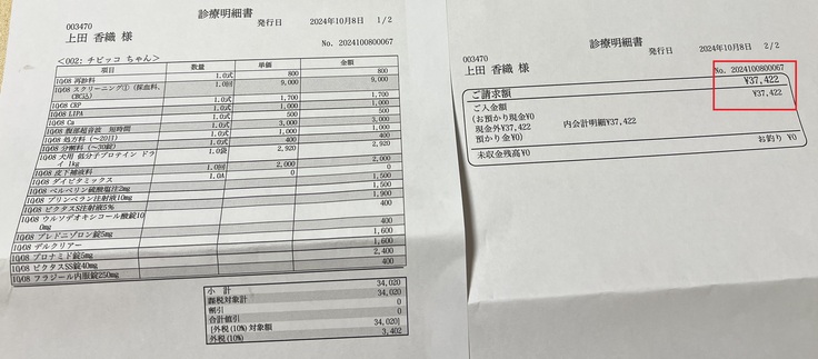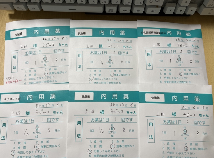 明日は担当獣医師がお休みのため、次回10/10にまた再診予約を取り、今日もらってきたお薬で明日は様子を見ることになりました。