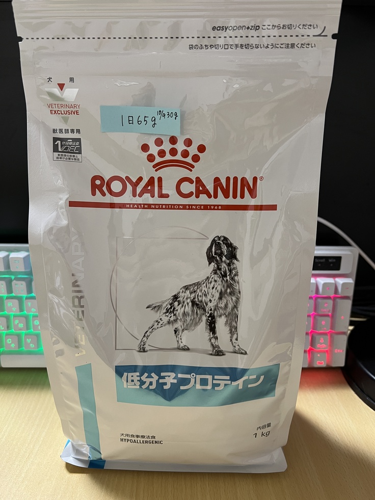 ということで下痢が続く大きな原因は突き止められなかったものの、まずは現状の体調不良を治すべく投薬を明日から開始して(今日は点滴しているので投薬はナシ)、一旦今まで食べていたフードやサプリメント・おやつなどを全て切って、消化器症状を呈するワンコに食物アレルギーの原因となりにくい上記の療法食だけに切り替えることになりました。