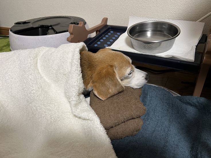いつもお昼は比較的落ち着いていますが、お水を飲んだりちょっと起きて動いたりすると調子が悪くなったり震えだす時もあるのでなかなか目が離せません。