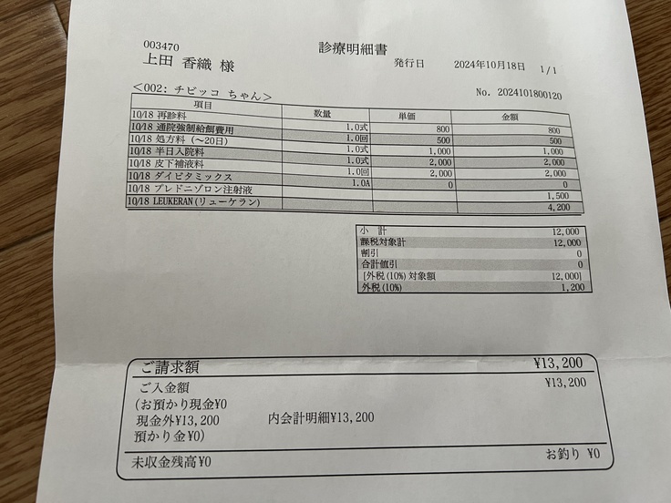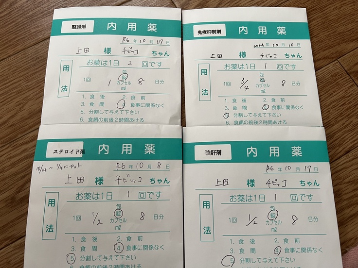 ③水分・下痢止め・ビタミン剤の皮下点滴は入院中、都度様子を見て投与(心臓に負担がないように)