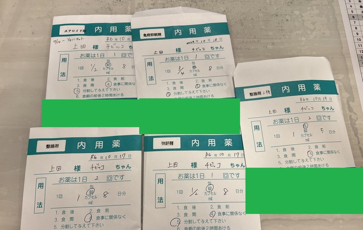 下痢と血便を繰り返しているため、新たに整腸剤2種類の追加とステロイド注射を投与しました。