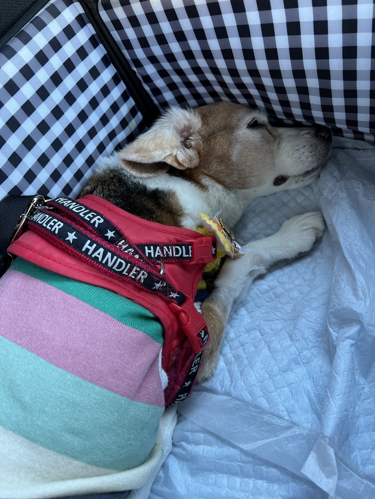 ちびっこは朝が弱いせいか病院に勘づいているのか「行きたくない~」と言いたいかのようにワザと脱力して見せて、今朝は肌寒かったのでお洋服を着せるのとハーネスを着けるのに苦労しました💦(着けた後は諦めて普通に起きましたw)
