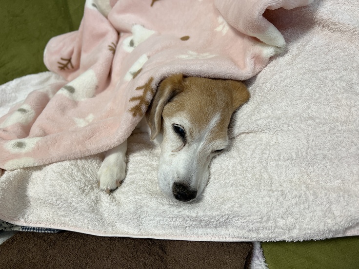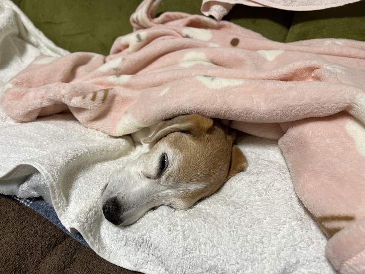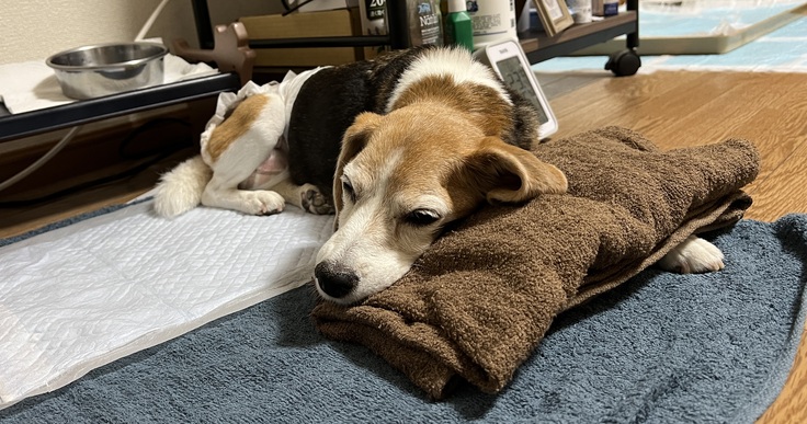 ゆっくり寝ていたかと思えば小刻みに震えたり、突然ムクっと起きてトイレの周りをウロウロすることがあり、やっぱり調子は良くないんだろうなぁという印象です。