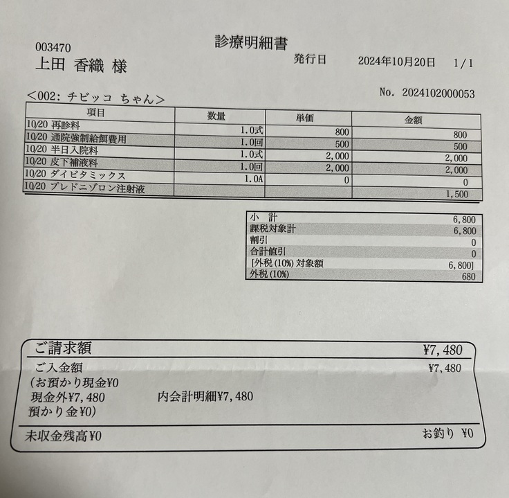 まだ食事量は通常の2/3ほどだそうですが、今日から1日の必要量を与えると仰ってました。