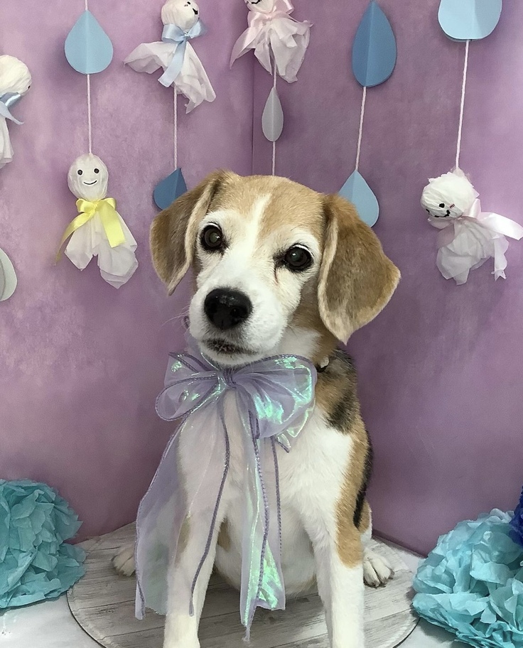 (↓今年6月の梅雨時期に病院併設トリミングサロンにて記念撮影してもらいました)