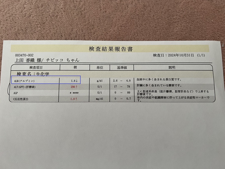 ↑一週間目の血液検査と同様にアルブミン(タンパク質)の数値に改善はなく、結果免疫抑制剤治療は効果がなかったと判断出来ました。