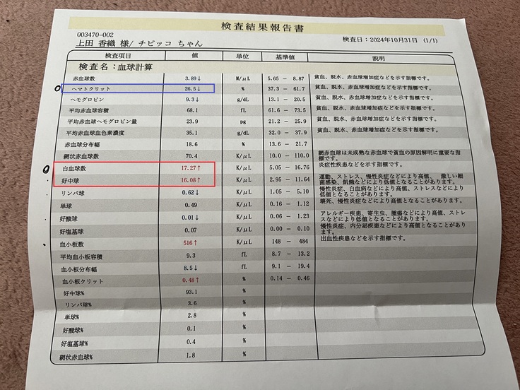 ↑ヘマトクリットも改善がなく、貧血や脱水の症状は続いており、白血球数も上昇数値のままで体のストレス反応も治まりませんでした。
