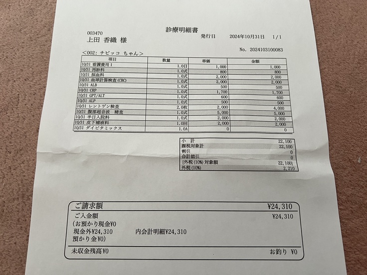 獣医師からは「これですべての治療を切ってしまうのではなく、週に2~3回の診察で身体検査をして嘔吐や脱水、胆嚢粘液嚢腫や整腸剤の投薬は続けて、下痢で24時間の看護は大変だろうから飼い主さんのストレス緩和のために、時には半日入院のサポートも頼って下さい」と頼もしいお言葉ももらえました。