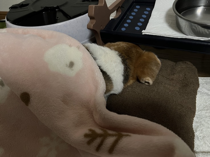 豚肉を少しとリンゴを少し食べてくれましたが、あまり食欲が湧かないようで眠ってしまいました。