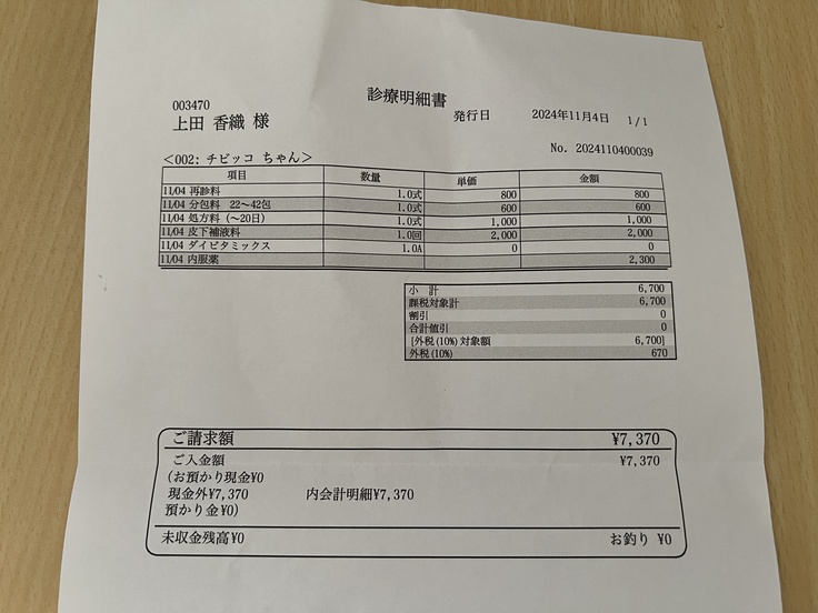 身体検査をしてもらって点滴とビタミン剤を打って、粉の整腸剤が無くなってしまったので追加でもらって帰って来ました。