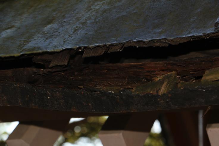 当初は、ご鎮座50周年で屋根の葺き替え工事を行う予定でしたが、予想以上に屋根の傷みが進行し、建築士から「今、修復をしないと本殿内に雨が入り、ご神体が鎮まる清浄な御殿が腐れる恐れがある」といわれました。一度雨が入ると、次の50周年までは、ご本殿を清浄に保つことができないと判断し、今年中に屋根の修復プロジェクトを立ち上げた次第です。