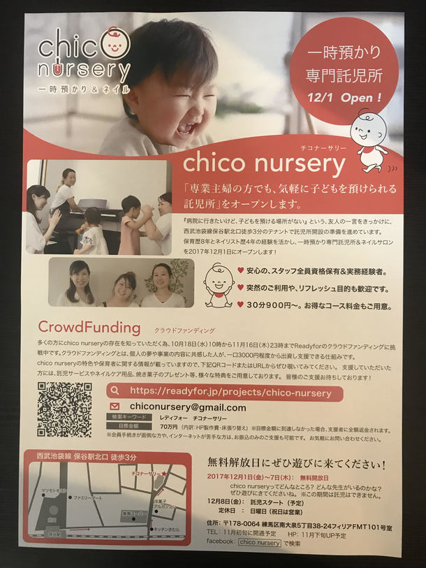 chico nurseryの事を多くの方に知っていただく為、そしてクラウドファンディングに挑戦中である事も知っていただく為に、チラシを作成しました!