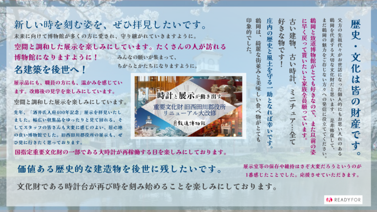 今回のクラウドファンディングは、大時計の修理と展示リニューアルはもちろんのこと、致道博物館のこれからの未来を作っていくものであると考えております。だからこそ、このように多くの方々から応援を寄せていただいたことに一同感動し、これからの致道博物館をより良いものにしていかなくてはと、より一層気合が入りました。