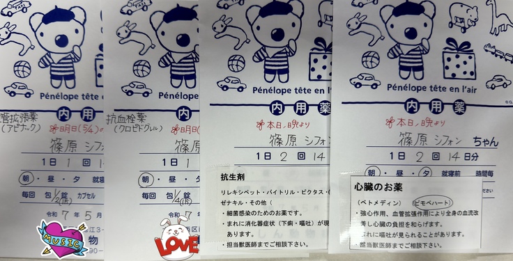 手術したばかりの心臓の動きを助けるためのお薬や傷口が化膿しないように飲むお薬、そして術後は血栓が出来やすいのでそれを防ぐお薬と今はまだたくさんのお薬を飲まなくてはなりませんがそれでもシフォンは家に帰れて嬉しそうです🎵