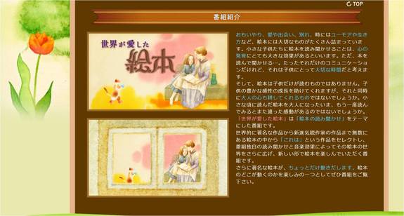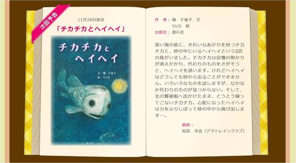 毎回1作品をセレクトし、 読み聞かせと音楽効果で絵本の新たな魅力を紹介。