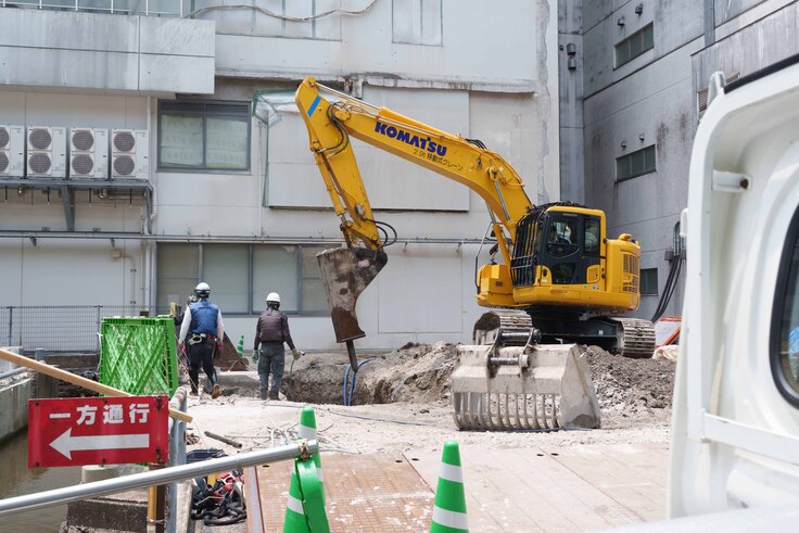 建築現場では薬剤棟の基礎工事の準備を本格的に進めています。本日は、重機で地面を掘削して地中に障害物などが埋まっていないか状況を確認していました。