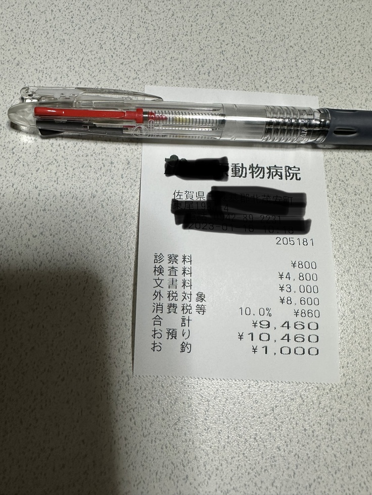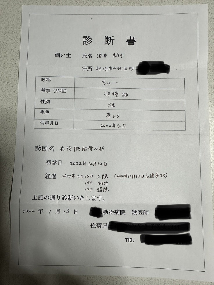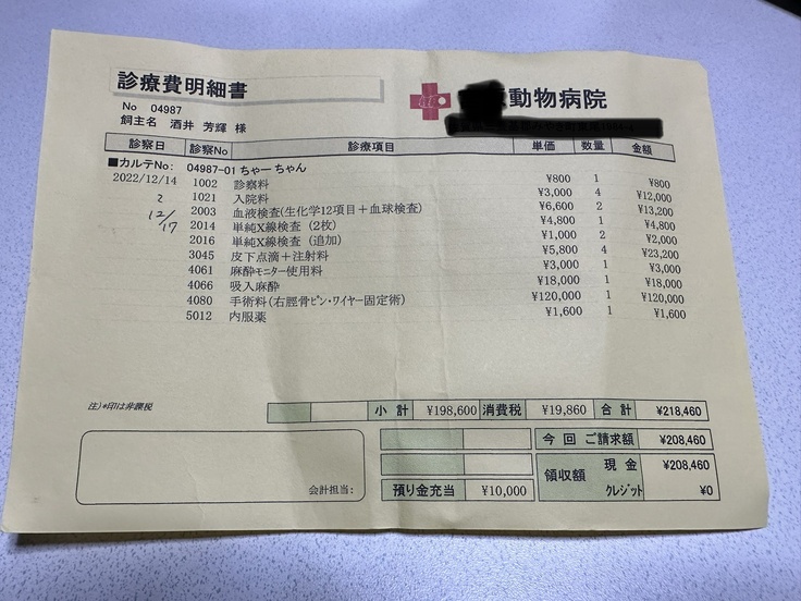 事故に遭った仔の手術・入院・治療費(こちらは一部支払い済みです。)