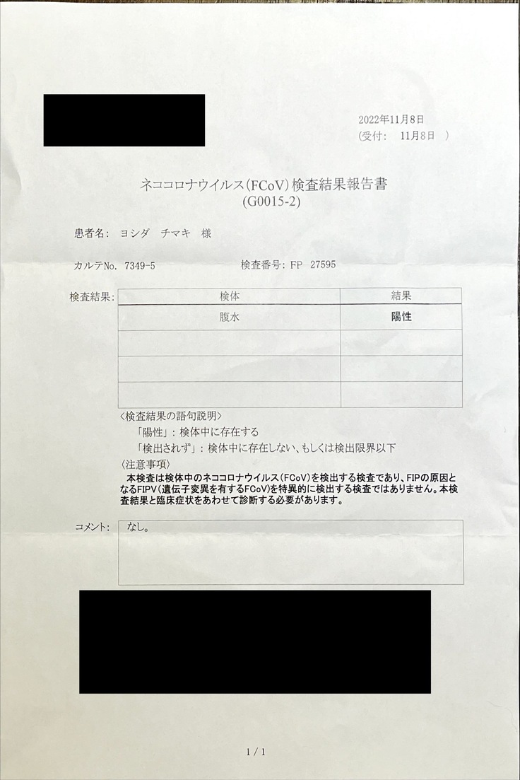 検査結果と症状を見て主治医の診断はほぼFIP確定とのことでした。