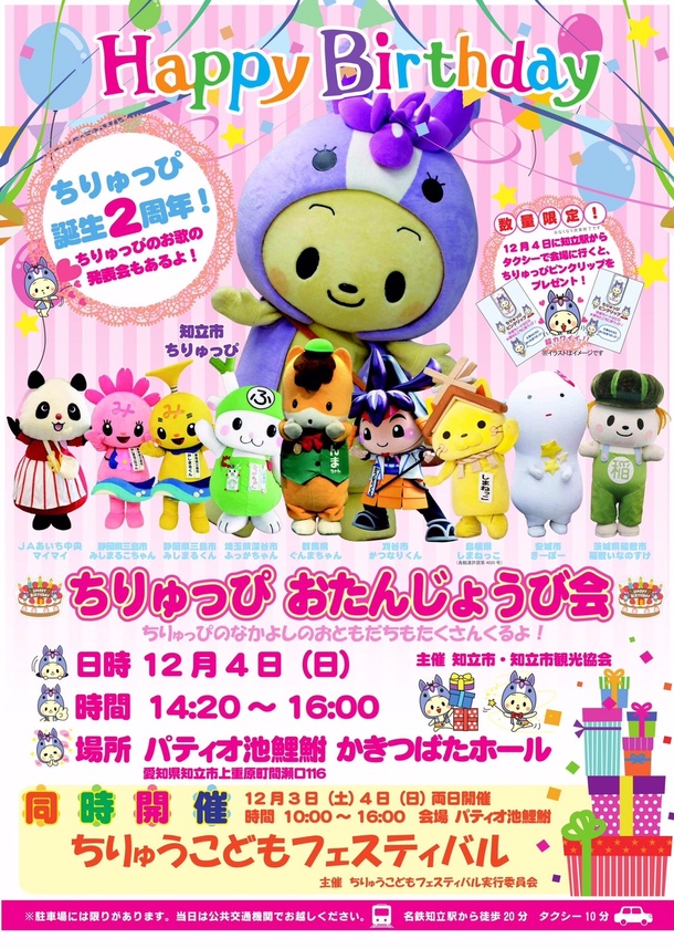 お友だちの「ぐんまちゃん」「ふっかちゃん」「しまねっこ」「かつなりくん」「きーぼー」「マイマイ」、それからぼくの兄弟の「みしまるくん」「みしまるこちゃん」「いなのすけ」がお祝いにかけつけてくれたっぴ。