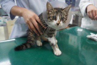 原因不明の機能性イレウス様症状との診断で、緊急処置が行われました。譲渡に向けて動物病院で健康チェック等を受けている時に腸閉塞が見つかったのは不幸中の幸いでした。腸管の壊死が進む前の処置だったため、小柄な子猫は無事、生還しました!