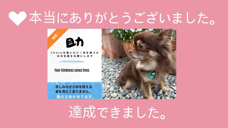 ご支援いただいた皆さま、生きていくために大切な資金をChocoのために使ってくださり、心よりお礼申し上げます。そして、毎日のようにSNSで拡散してくださった仲間の皆さま(仲間と呼ばせてください)、貴重な時間を割いて素敵な画像を作成し、協力してくださり、本当にありがとうございました。