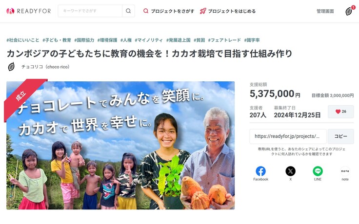 この結果は、クラファンを始める前には全く想像もしていなかった支援者の方の人数と金額で、ご支援くださったすべての方に、そしてこの挑戦をサポートしてくれたReadyForさんとチョコリコのスタッフにも、心からお礼を伝えたいと思います。