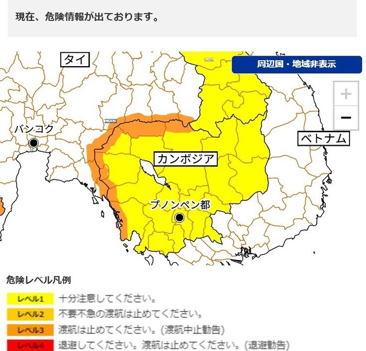▲カンボジア全土タイ国境30km以内はすべて渡航中止勧告エリアです(外務省のHPより)