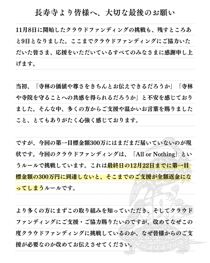 また、長寿寺の取り組みを一人でも多くの方に知っていただきたく、情報拡散にもぜひご協力を賜れますと幸いです。