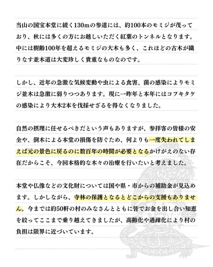 本堂や仏像などの文化財については国や県・市からの補助金が見込めます。しかしながら、寺林の保護となるとどこからの支援もありません。今までは約50軒の村のみなさんとともに皆でお金を出し合い知恵を絞ってここまで乗り越えてきましたが、高齢化や過疎化により村の負担は限界に近づいています。