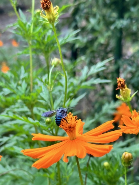 幸せを呼ぶ青いハチとの愛称もある希少な「ルリモンハナバチ」が境内に飛来しました。